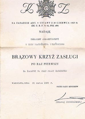 У 1933 годзе польскія ўлады ўзнагародзілі Ігната Абрамовіча Памятным Крыжам да 70-годзя Студзеньскага паўстання. У 1938 годзе ён быў запрошаны ў Варшаву на 75-я ўгодкі паўстання. Ветэрану выдалі за кошт вайсковага бюджэту 16 злотых на дарогу. У тым жа годзе Абрамовіч атрымаў Бронзавы Крыж Заслугі. Захавалася пасведчанне на гэты конт за подпісам прэм’ера апошняга ўраду даваеннай Польшчы — генерала Феліцыяна Славой-Складкоўскага. Ігнат Абрамовіч, як і ўсе астатнія жывыя паўстанцы, быў падвышаны да першага афіцэрскага звання (лейтэнант).