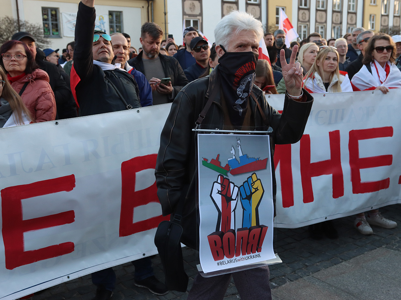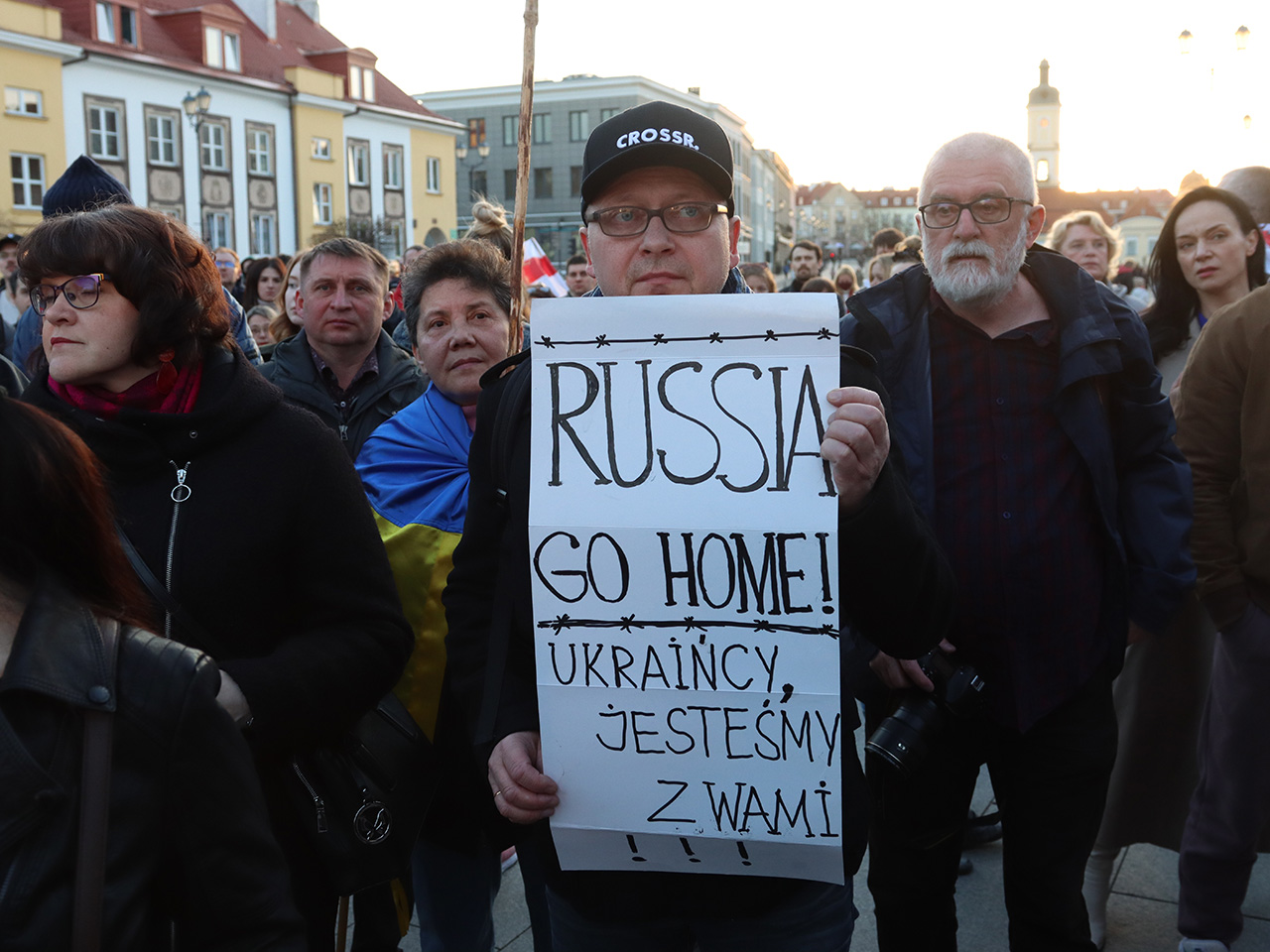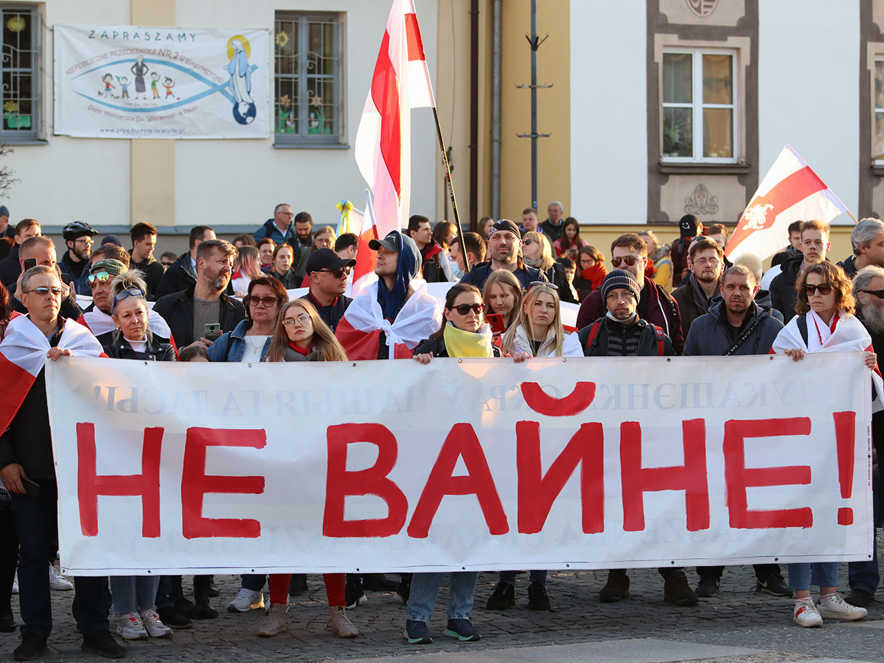 Прыкладна праз гадзіну мітынг пачаўся ў самым цэнтры Беластока — ля помніка Юзафу Пілсудскаму на Рынку Касцюшкі. Людзі разгарнулі вялікі бел-чырвона-белы сцяг. Багата было і ўкраінскіх сцягоў, а таксама значкоў, плакатаў і расцяжак з беларускай і ўкраінскай сімволікай. Шмат хто прыйшоў з дзецьмі.