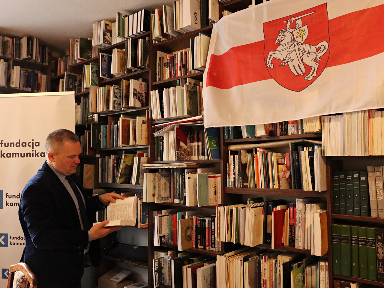 З Яраславам мы сустрэліся на сядзібе БГТ і Фонду Kamunikat.org непадалёк цэнтра горада. На паліцах безліч кніг: гістарычная і мастацкая літаратура, мемуарыстыка, краязнаўства, слоўнікі, газеты і часопісы. Сапраўдны беларускі «кніжны каўчэг». Усё гэта патроху «пераплаўляецца» ды паўстае ў лічбавай форме на партале Kamunikat.org