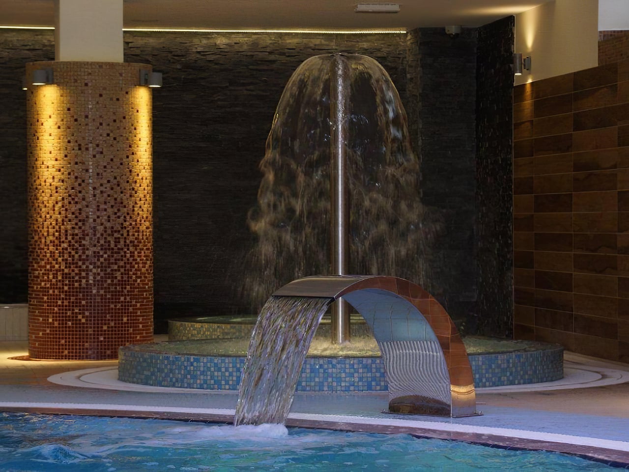 У цэнтры памяшкання рэкрэацыйны басейн — глыбінёй паўтара метра з гейзерам і двума воднымі масажнымі каскадамі. З аднаго боку — джакузі і два бродзікі для дзяцей (адзін заяўлены як з водным парасонам, але пры мне гэтак не працаваў). А з іншага — сауны, гарачыя лежакі і снежная пячора. Сауны чатырох відаў — сухая, паўсухая, інфрачырвоная, паравая. Кожная па-свойму крутая, галоўнае не забываць здымаць тапкі на ўваходзе (пра гэта таксама вісяць напаміналкі). Ëсць душоўкі для кантраснага душа (таксама падпісаныя), якія ўвогуле ідэальныя, калі выйсці пад іх са снежнага гроту — тэмпература ў ім, дарэчы, мінус 15.