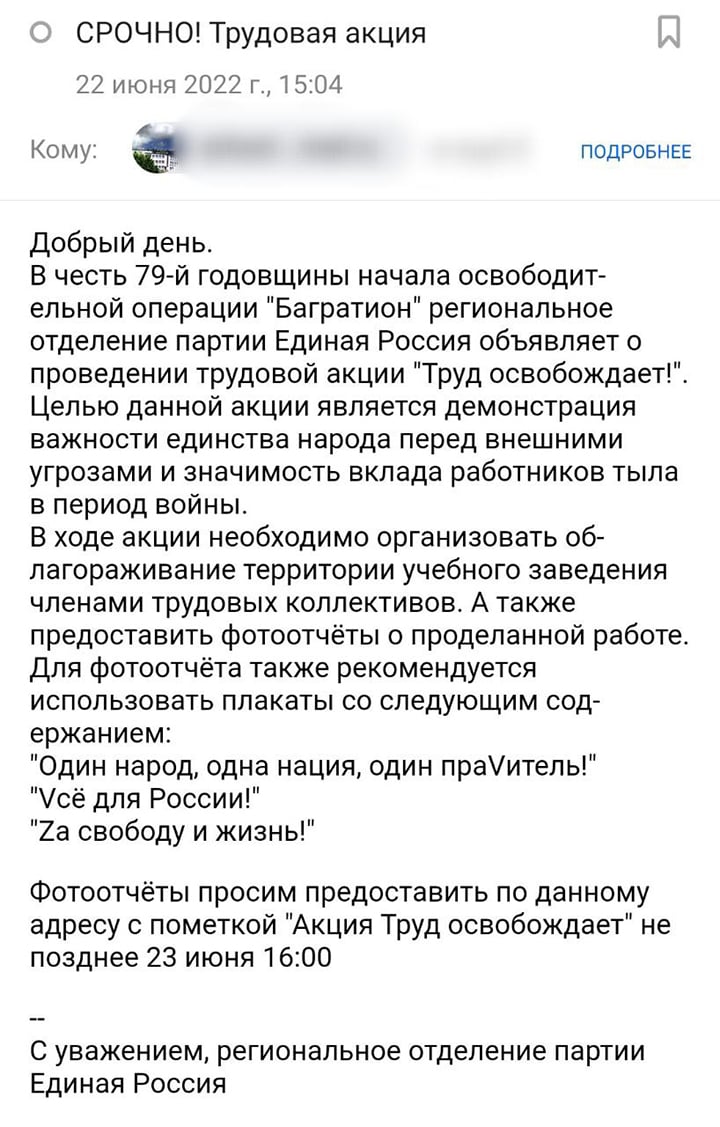 От имени «регионального отделения партии “Единая Россия”» он потребовал провести трудовую акцию в честь «79-й годовщины начала освободительной операции “Багратион”». В ходе акции необходимо было облагородить территорию школы заведения силами трудового коллектива и прислать фотоотчёт. Также в письме, которое Влад выслал на электронную почту школы, содержались рекомендации использовать определённые плакаты.