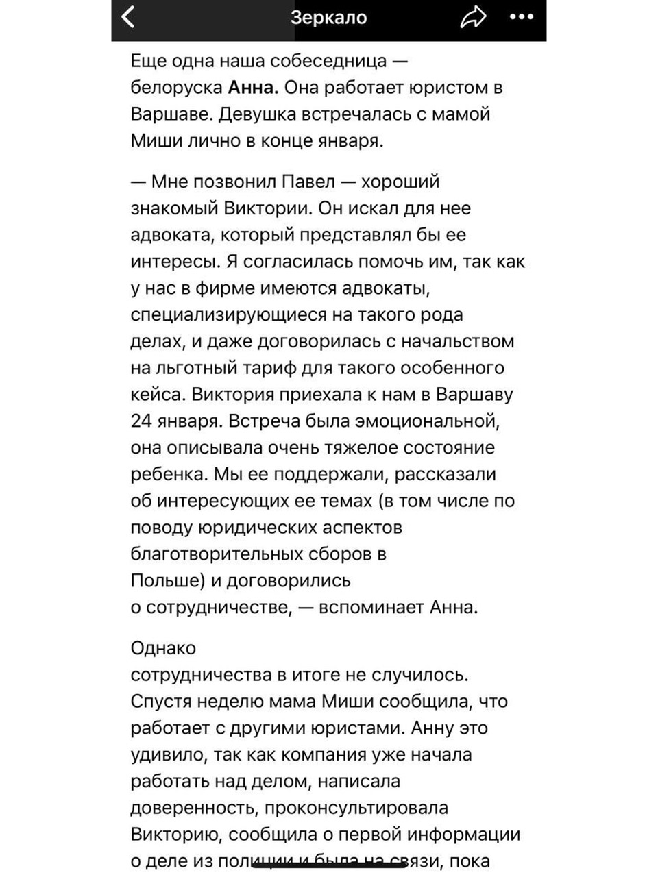 За маму Миши вступился адвокат польской фундации — но странно, деньги 7 000 злотых за адвокатские услуги Виктория переводила совсем другому адвокату. Здесь стоит упомянуть, что адвокат был девушке предоставлен так же бесплатно, как и лечение на территории Польши.