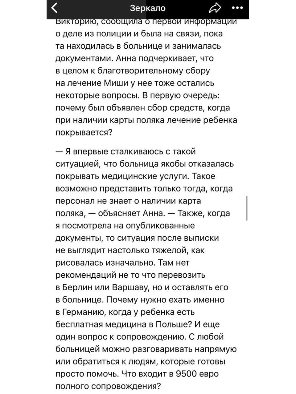 Одновременно она с бывшим мужем и его сестрой открываю сбор денег на оплату счёта из больницы Белостока, адвоката и реабилитацию Миши. Буквально в этот день в статьях журналисты упоминают, что у ребенка есть Карта поляка, а значит по польскому законодательству лечение для него будет бесплатным. Но Виктория этот факт не комментирует.