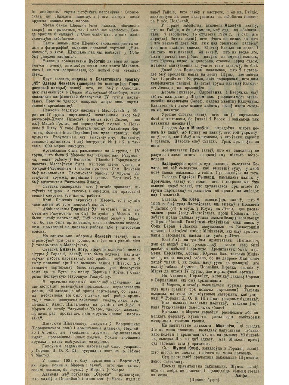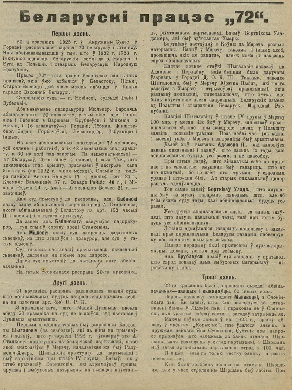 20 красавіка 1925 годзе ў Акруговым судзе ў Гродне пачаўся працэс 72 беларусаў і літоўцаў, якія ўдзельнічалі ў антыпольскім партызанскім руху. Абвінавачаныя атрымалі да 12 год цяжкай турмы. Гэта быў адзін з самых вялікіх палітычных працэсаў у міжваеннай Заходняй Беларусі.