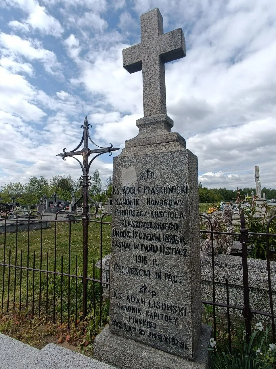 «Святой памяці. Кс. Адольф Пласкавіцкі. Ганаровы канонік, пробашч Кляшчэльскага касцёла. Нарадзіўся 17 чэрвеня 1886 года, заснуў у Госпадзе 11 студзеня 1915 года. […] Кс. Адам Лісоўскі. Канонік Пінскай капітулы. Жыў 45 гадоў. Памёр 9 кастрычніка 1929 года».