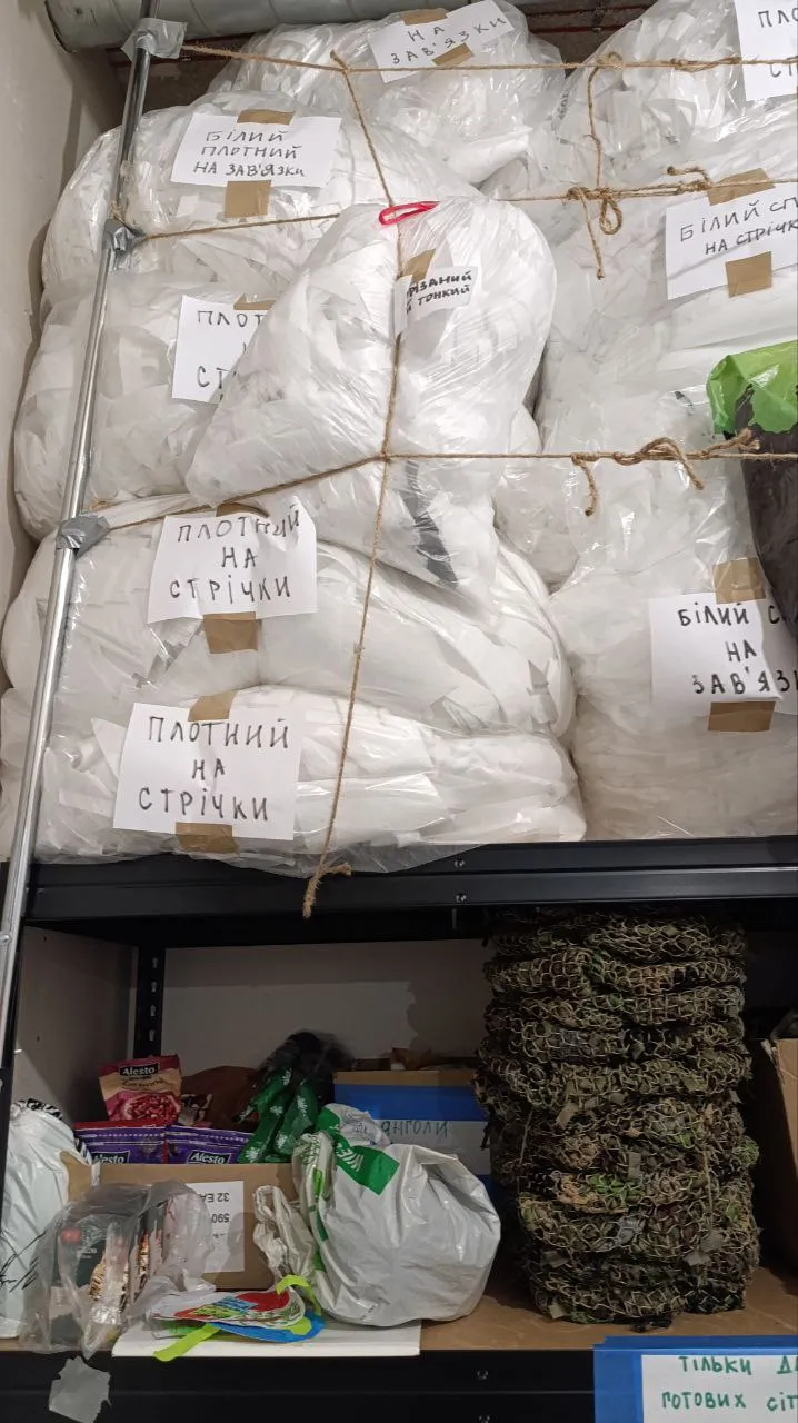 Матэрыялы, з якіх робяць маскіровачныя сеткі, — лёгкія, не ўбіраюць вільгаць і слаба гаручыя. Аснова — спанбонд, зверху нашываюцца палоскі тканіны. Колеры падбіраюць у залежнасці ад сезона і ўчастка фронту: улетку — зялёныя, карычневыя, пясочныя адценні, узімку — пераважна белыя. Частку матэрыялаў прывозяць самі валанцёры, частку даюць спонсары або проста добрыя людзі.