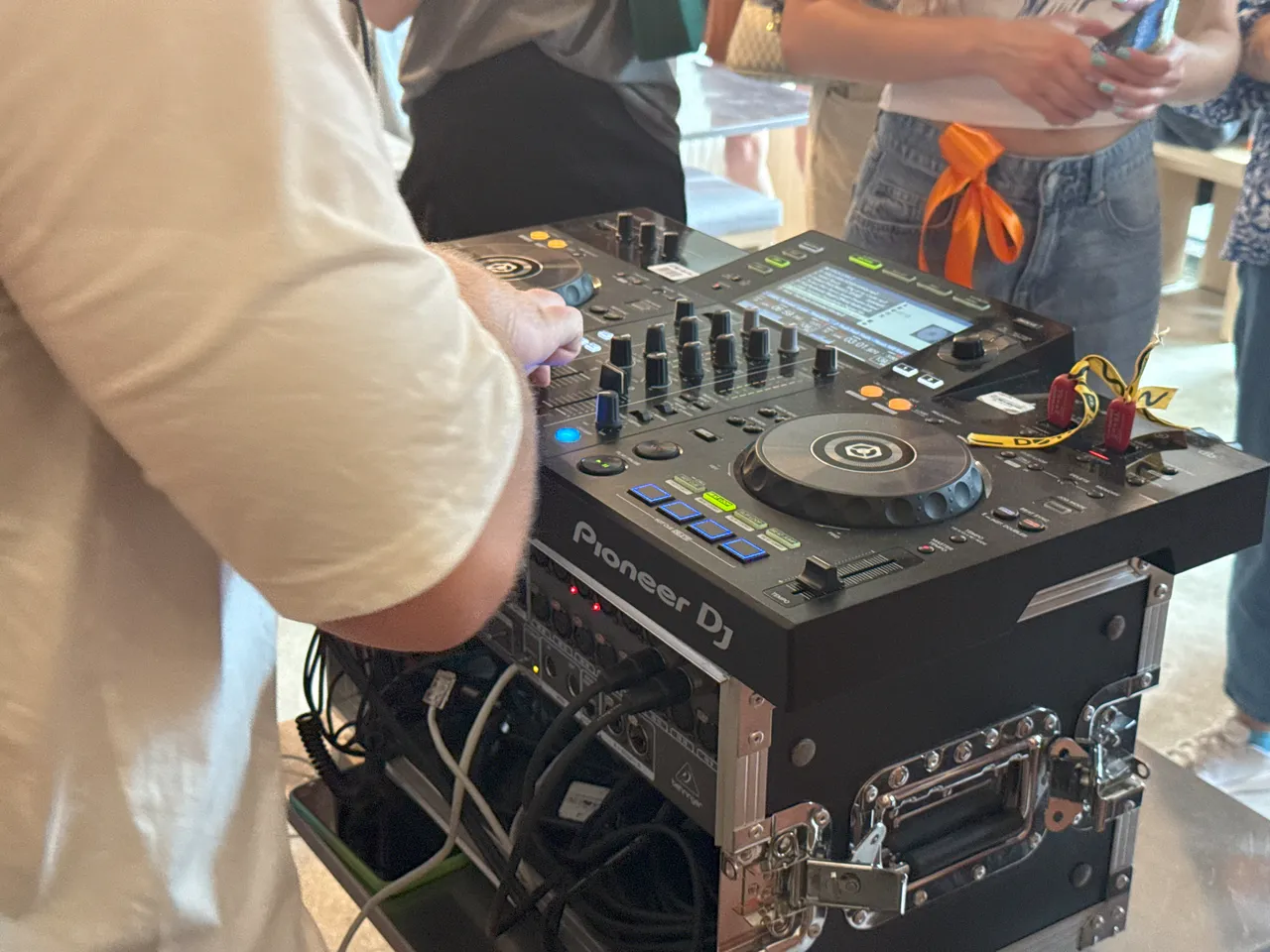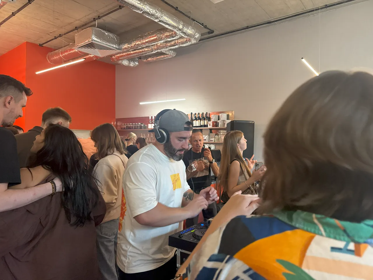 Одни гости выстраиваются в очередь за напитками, другие — вовсю танцуют, как на настоящем рейве. Музыка — громкая, но не оглушительная. Вокруг диджея ритмично двигаются девушки в ярких нарядах.