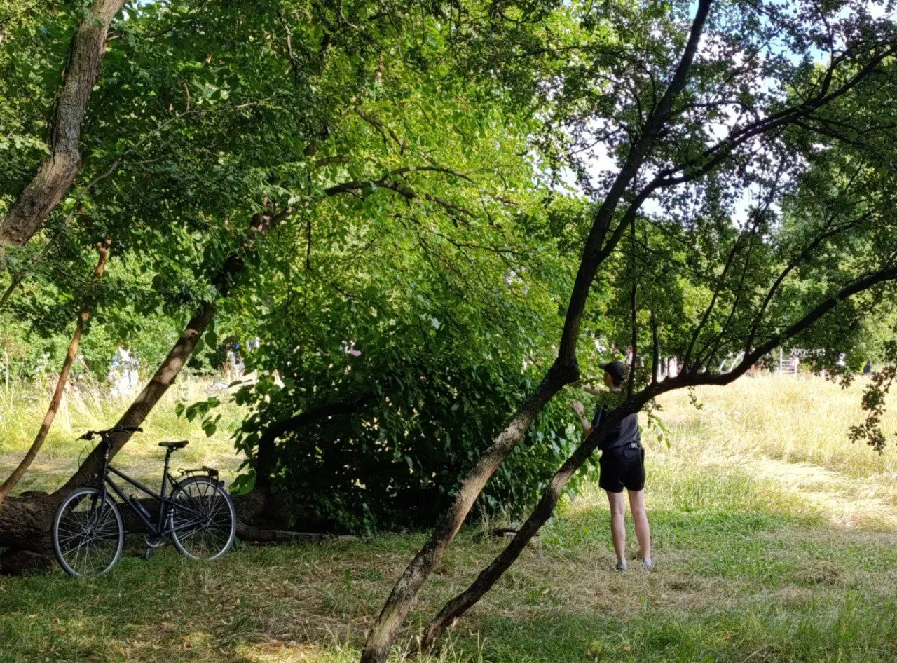 Судя по всему, место привлекло не только нас. Девушка внимательно рассматривает ветку дерева. Но заметив нас, уезжает на велосипеде. Подходим — ягоды зеленые, до спелых не дотянуться.