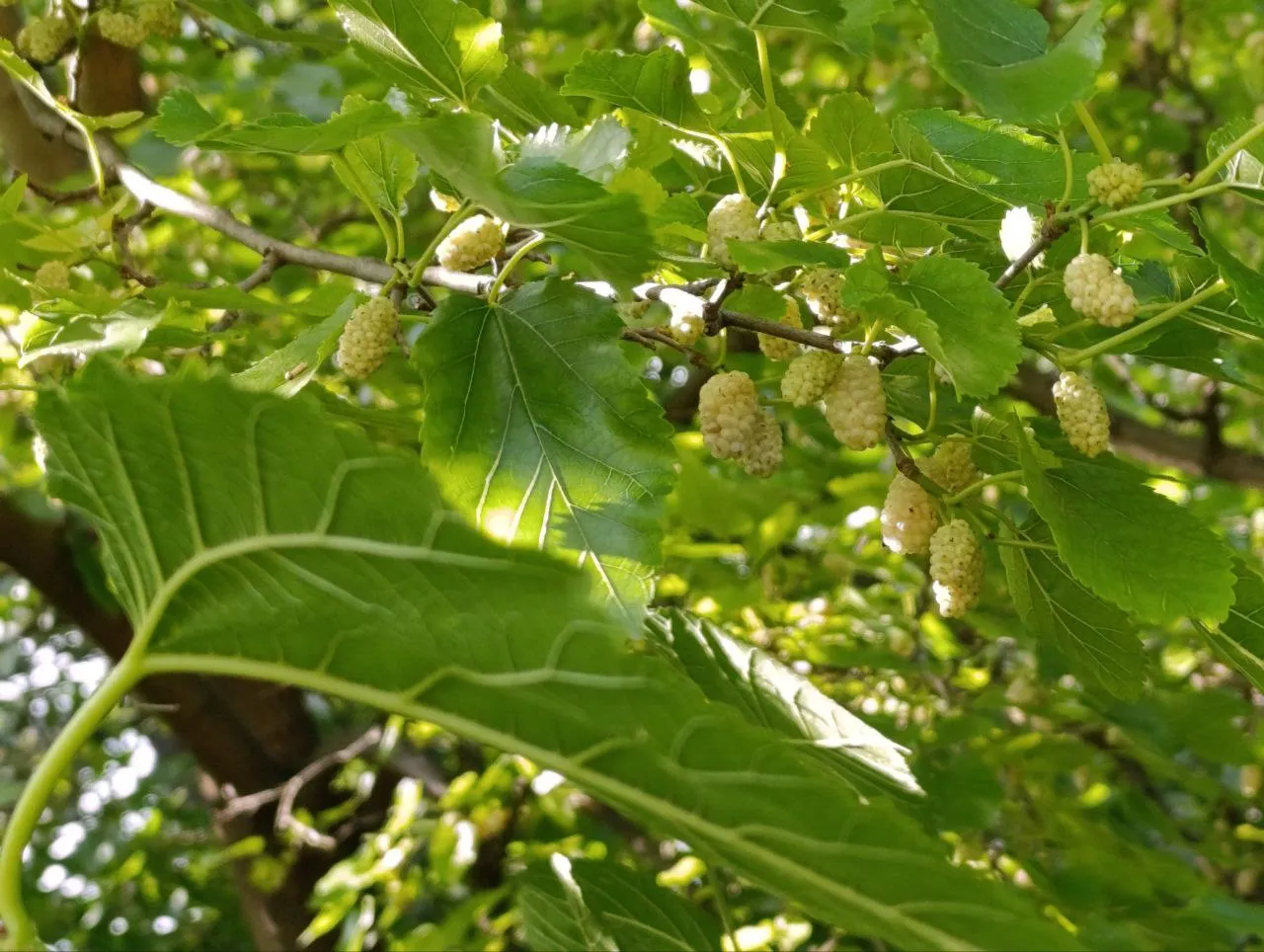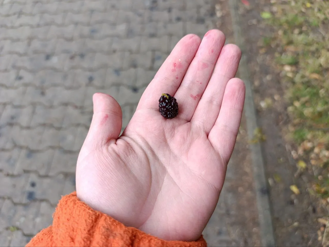 Ближайшая к нам точка — шелковица. Ягоды уже осыпались — тротуар под деревом темно-фиолетовый. Те, что еще висят, — слишком высоко. Но до одной все-таки удается дотянуться. Больше в этом месте ничего не добыть.