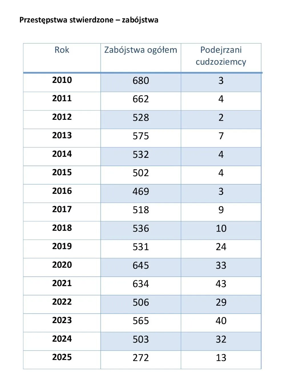 В 2024 году в Польше зафиксировано 503 убийства, при этом подозреваемых иностранцев было 32 (6,4% от числа преступлений). А в 2023 году в Польше было совершено 565 убийств, а подозреваемых иностранцев было 40 (7,1%).