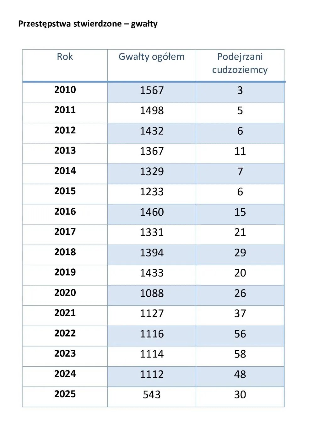За первое полугодие 2025 года статистика незначительно выросла. Зафиксировано 543 изнасилования, а подозревают 30 неграждан Польши (5,5%).