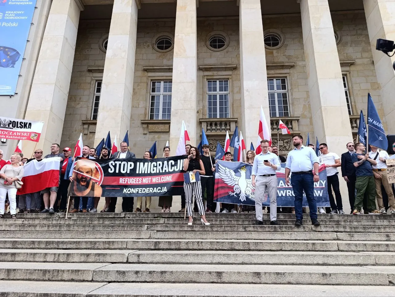 Во Вроцлаве, где сторонники «Конфедерации» собрались у воеводской администрации к обычным антииммигрантским тезисам добавились требования блокировать практику возврата мигрантов из Германии в Польшу.