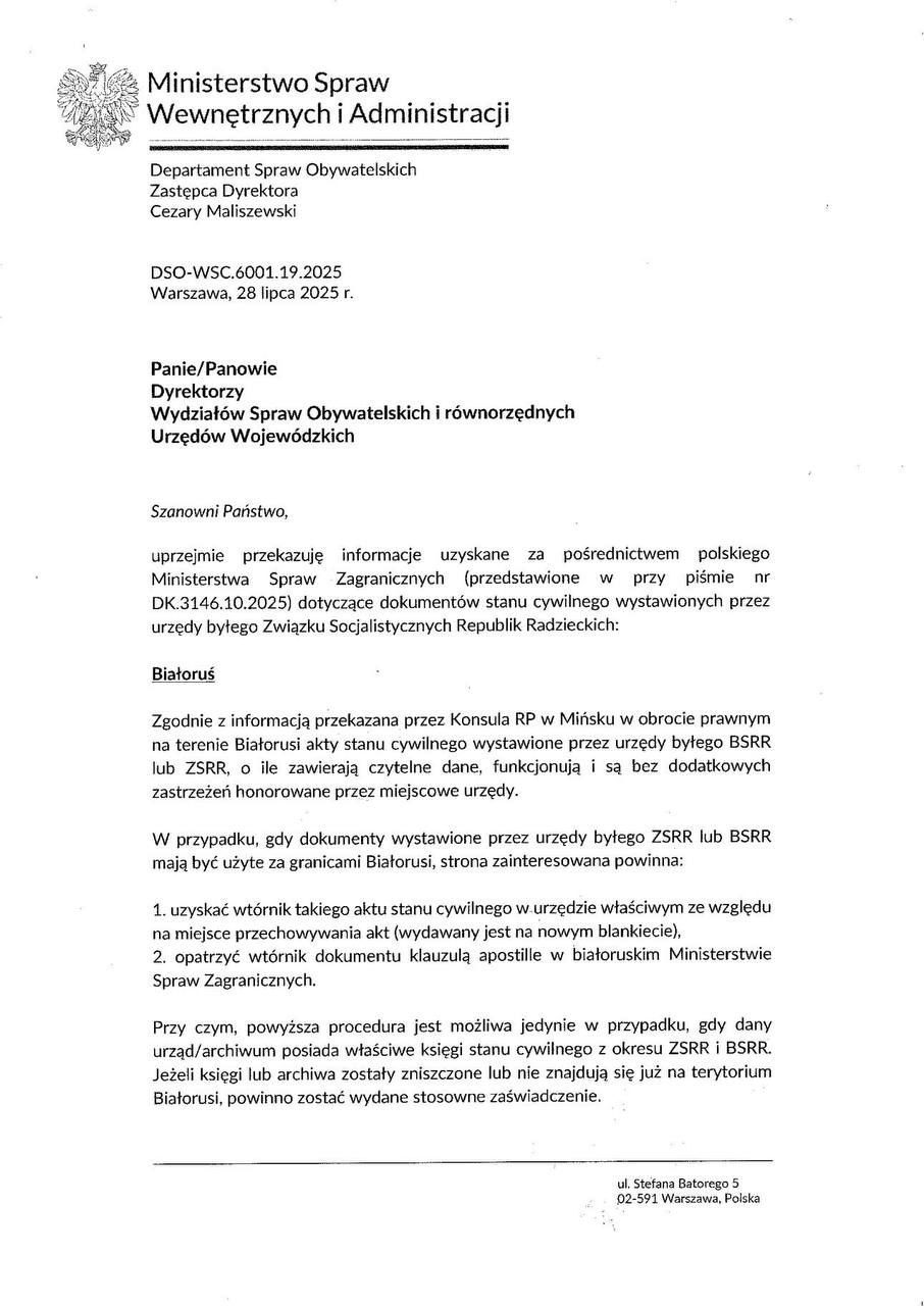 В документе говорится, что, согласно информации от консула Польши в Минске, в Беларуси до сих пор действительны акты гражданского состояния, выданные органами бывшей БССР или СССР, если в них содержатся читаемые и понятные данные.