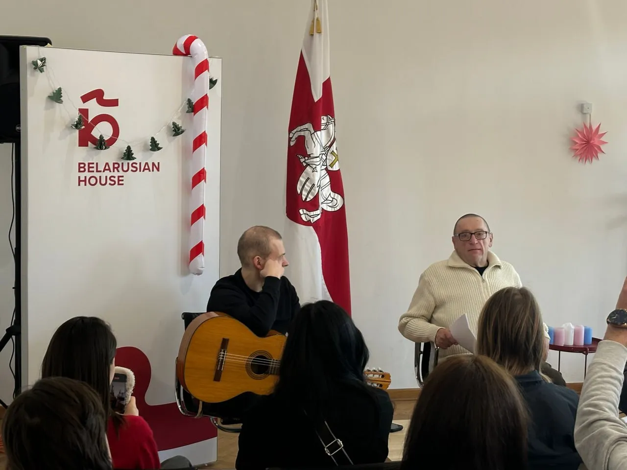 Среди приглашенных — политолог Александр Федута (он читает стихи) и юрист Максим Знак, который пришел с гитарой. Оба тоже освободились 13 декабря. Когда Знак исполняет известные песни, например «Тры чарапахi», собравшиеся начинают подпевать. Часть песен он написал в заключении, для публики это премьерное исполнение. После них аплодируют не сразу: сначала короткая пауза — потом сдержанные аплодисменты.